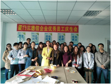 为弘扬公司“军队、学校、家庭”的企业文化,让员工感受到三德信大家庭的温暖,给员工长期以来辛勤工作给予肯定和感谢,表达公司对员工的点滴关怀,每月中旬,厦门三德信企业都会为优秀员工举行庆生会,为当月的优秀员工寿星们送上公司的祝福。