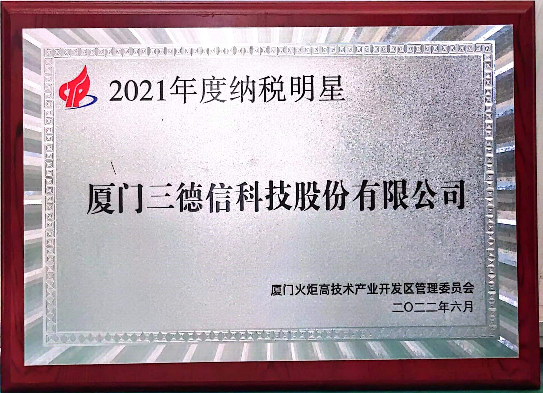 近日 ,厦门火炬高技术产业开发区管理委员会授予厦门三德信科技股份有限公司“2021年度纳税明星”荣誉称号,此次入选是三德信公司继2019年度荣获纳税明星企业后,火炬高技术产业开发区管理委员会对三德信公司主动承担社会责任、依法纳税、诚信经营的再次肯定,也是对三德信公司业务快速发展的鼓励。