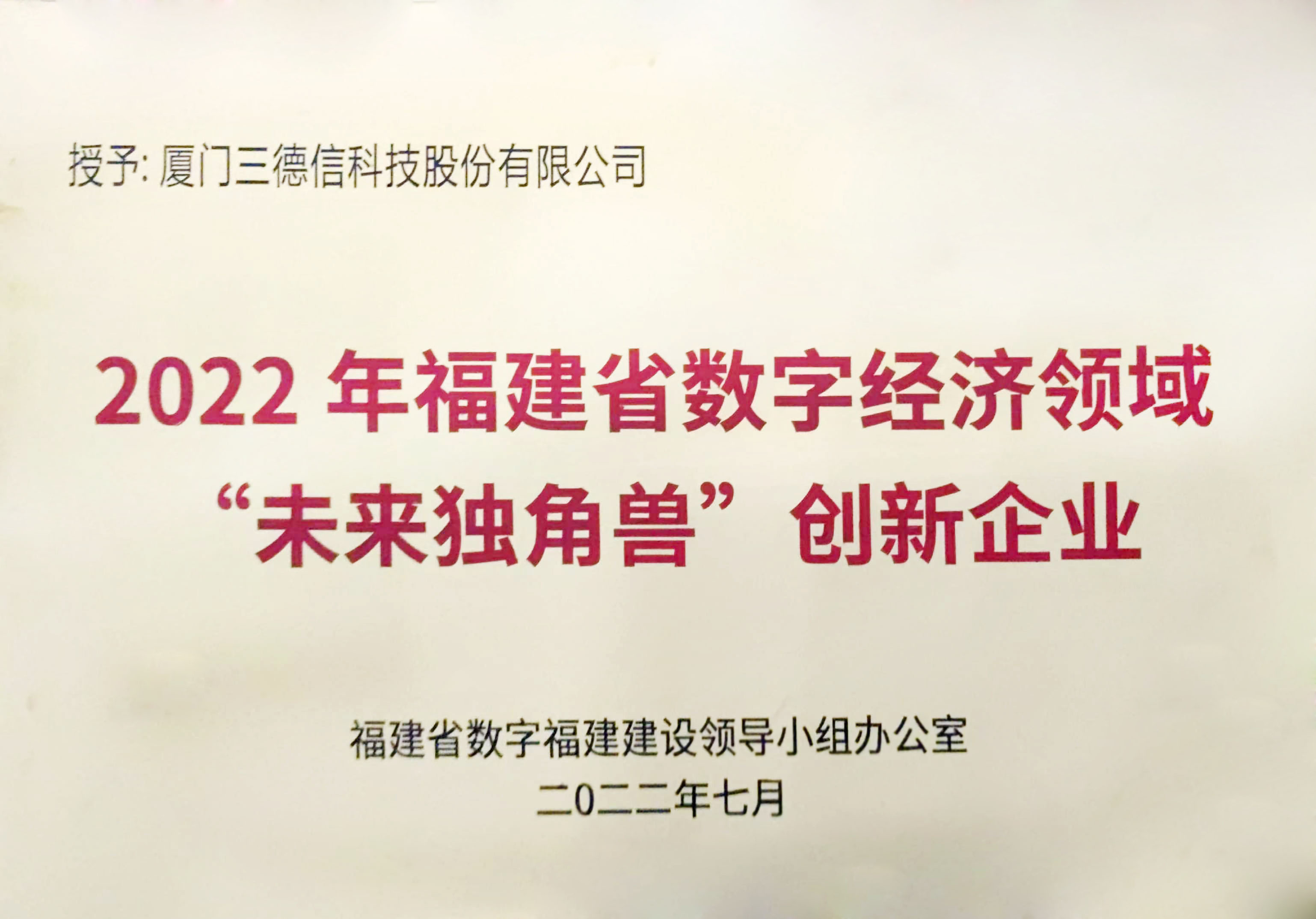 三德信公司已连续两年荣膺福建省数字经济领域“未来独角兽”创新企业。